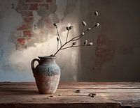 Een retro vaas, op een oude houten tafel, met een bloesemtak er in. Op de achtergrond een oude bakstenen muur. Het beeld is gegenereerd met behulp van ai.