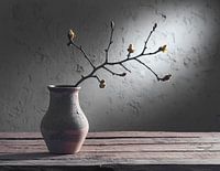 Op een oude tafel met dikke balken, staat een retro vaas met een tak met jonge knoppen. Het licht valt door een raam naar binnen, op een oude verwaarloosde muur, en geeft een fijne sfeer in de ruimte. Het beeld is met behulp van ai gegenereerd.