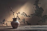 Bij een oude vervallen muur, in een oud gebouw, staat een houten tafel met een retro vaas. In de vaas staat een tak met jonge knoppen. Het beeld is met behulp van ai gegenereerd.