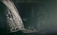 Vintage vitrage wapperend in de wind door het kapotte raam op een urbex locatie in Belgie. Foto in vintage look.