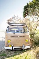Prachtige vintage Volkswagen camper busje in de natuur in Frankrijk. Deze retro auto zorgt voor een heerlijke vakantie. Het busje is prachtig beige van kleur en kleurt daarom mooi in de natuur en het landschap.