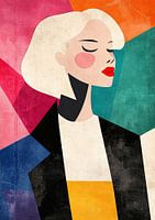 Een prachtige illustratie van een vrouw met wit haar, in de stijl van gedurfde grafische illustraties, retro poster minimalisme en vintage-geïnspireerde mode. De kleuren zijn rood, turquoise, zwart en roze, tegen een vlakke, mid-century moderne achtergrond.