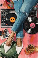 Een nostalgische compositie die de essentie van retro lifestyle vangt met een moderne twist. Tegen een levendige roze achtergrond rust een paar elegante witte pumps naast vintage vinyl platen en een klassieke platenspeler met een vrolijke smiley. Versleten spijkerstof en een glas whiskey completeren deze sfeervolle scène die jeugdsentiment en hedendaagse stijl perfect verenigt.