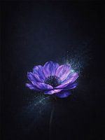 Een levendige violette bloem straalt zacht licht uit tegen een diepblauwe achtergrond. Sprankelende texturen voegen een dromerige dimensie toe en brengen rustige elegantie in minimalistische interieurs.