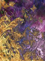Het beeld toont een goudgetinte vogel temidden van bloemen, met vlinders die lichtjes boven de compositie zweven. De paarse achtergrond contrasteert met warme metalachtige accenten. Laag-op-laag…