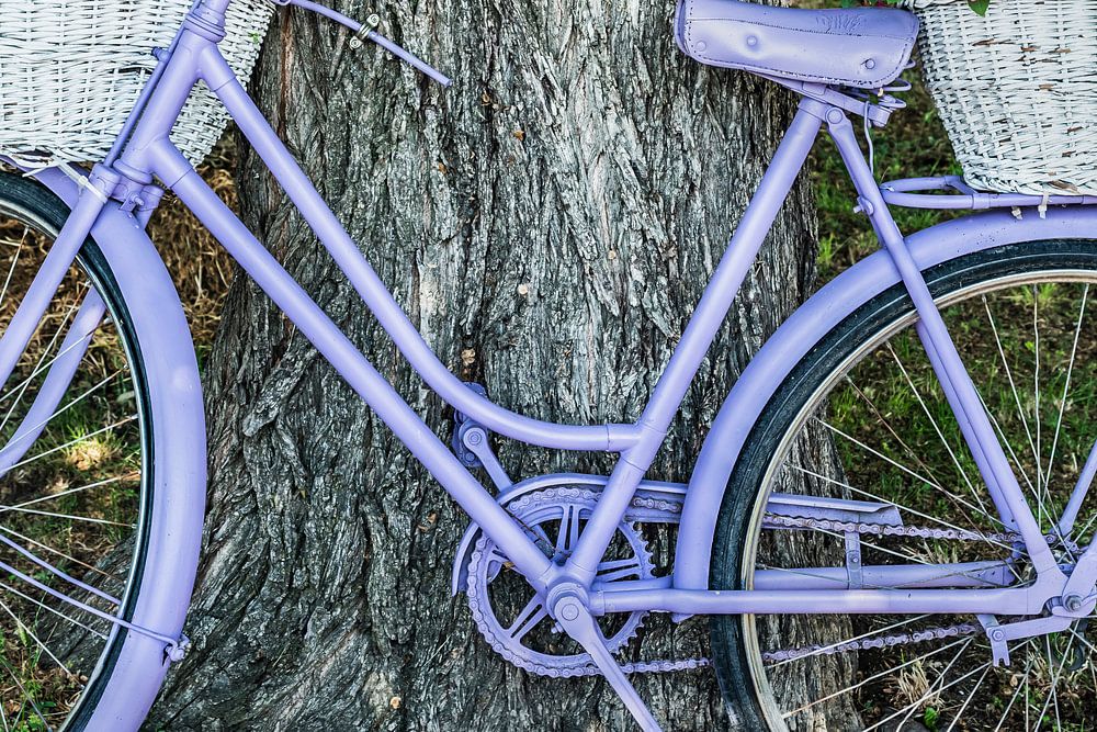 Een paarse fiets leunt tegen een boom. Op de bagagerekken staan twee witte manden met bloemen.