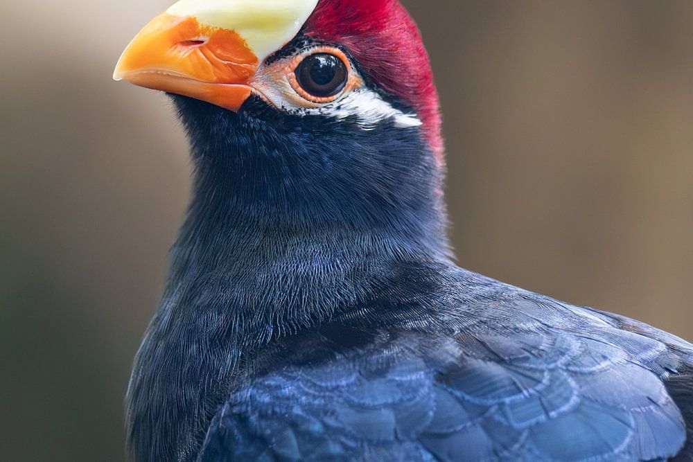 Portret van een Violette toerako, ook bekend als de violette schildtoerakor (Tauraco violaceus). Dvogel is van opzij genomen en kijkt in de camera. Hij komt van origine uit Afrika.