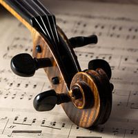 Krul van viool liggend op bladmuziek.
