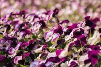 De foto toont een weelderig veld met bloeiende violen (Viola ×wittrockiana) in verschillende tinten paars en wit. De bloemen staan dicht op elkaar en vormen een intens gekleurd oppervlak, dat wordt aangevuld door het weelderige groen van de bladeren. De licht onscherpe achtergrond versterkt het diepte-effect en trekt het oog naar de…