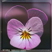 Een close-up foto van een paars viooltje voorzien van een vintage retro look door middel van een toegevoegd kader en een filmframe . Een vierkant beeld met een vleug nostalgie.
