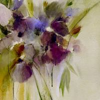 Een aquarel van viooltjes, blauw-paars van kleur, losse toets.