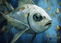 Vis Blauw | Ocean Glimmer - Dit vis schilderij toont een grote, expressieve vis met een helder, levendig groen oog, waarbij de penseelstreken en de goudkleurige decoraties opvallend zijn op een dominante blauwe achtergrond.