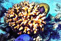 Gebaseerd op een foto die ik jaren geleden onder water nam, toen de koraalriffen over de hele wereld bloeiden en krioelden van de vissen, toont dit gestileerde fotokunstbeeld