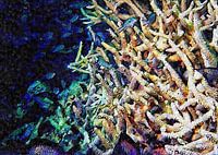 Gebaseerd op een foto die ik vele, vele jaren geleden nam tijdens een duikexpeditie in Indonesië, toont dit gestileerde fotokunstbeeld een cluster van vissen en koralen. Tegen de prachtige donkerblauwe kleuren van de oceaan en de vissen vormen de vingerkoralen interessante vormen en patronen.
