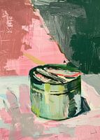 Een abstract geschilderd kunstwerk van vis in blik. Mooie donkergroene kleuren tegenover roze voor een sterk contrast.