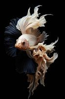 Een zeeleven in verstilling, de vis glijdt door een donkere zee van het doek, abstracte vinnen trillen als stille poëzie. Een elegante compositie ademt een sjieke rust uit, waar de gestileerde vis zweeft in mysterieus duister. Kleuren dansen als schaduwen op de diepe achtergrond, terwijl de vis een meesterwerk is van serene gratie. Het schilderij roept een gevoel van tijdloze harmonie op, waarin de vis, als een stille symfonie van de zee, een stilleven van elegantie en rust belichaamt.