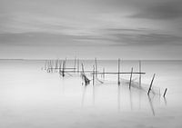 Fuiken in de Noordzee bij het vissersdorp Stellendam. Door het gebruik van een lange sluitertijd (30 seconden) is het wateroppervlak vrijwel egaal geworden, evenals de grijze novemberlucht.