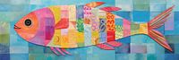 Vis - Dit speelse en kleurrijke schilderij presenteert een abstracte vis, samengesteld uit veelkleurige collage-elementen tegen een gestructureerde blauwe achtergrond. Het geeft een verfrissende draai aan maritieme thema's en is een levendig gesprekspunt voor elke moderne ruimte.