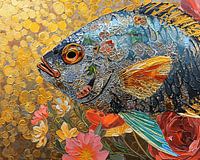 Vis - Op deze dynamische afbeelding zie je een expressief portret van een vis, weergegeven met een rijk palet aan kleuren tegen een gouden achtergrond die fraai speelt met het licht. De gedetailleerde textuur en het levendig contrast tussen de koele blauwtinten van de vis en de warme gouden en oranjerode bloemmotieven creëren een boeiende compositie.
