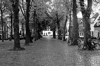 Ik heb deze foto gemaakt op de vischmarkt in Harderwijk, ik stond met mijn rug tegen de voor Harderwijk bekende Vischpoort. Zoals je aan de bestrating kunt zien had het geregend waarvoor ik stond te schuilen. Ik heb ervoor gekozen om deze foto in zwart-wit te maken en ook liggend. Omdat ik tegen de poort aan stond kon ik net iets langere sluitertijd gebruiken. De bomen wat je ziet zijn loofbomen, om welke loofbomen het gaat weet ik niet precies om eerlijk te zijn. Op deze plein staan altijd wel fietsen geparkeerd, ik weet niet of het van de bezoekers of bewoner zijn.