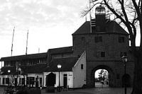 Ik heb deze foto van de Vischpoort gemaakt gemaakt in Harderwijk. Het is de Vischmarkt zijde van deze mooie en kenmerkende poort. Deze stadspoort met een lichthuis is wel het meest vastgelegde poorten van de stad Harderwijk. Het is ook een mooie poort aan een mooie plein. Links op de foto zie je kleine muurwoningen die tegen de stadsmuur staan, er achter zie je de masten van een driemaster die in de haven aan de boulevard licht. Ik heb ervoor gekozen om deze foto om te zetten naar zwart-wit.