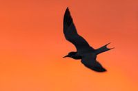 Vliegende Visdief (Sterna hirundo) tegen een kleurrijke oranje lucht.