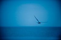 Minimalistisch landschap in blauwtinten. Visdiefje zwevend met gespreide vleugels boven zee. Deze foto lijkt op een cyanotype / blueprint, maar is het niet. De blauwe sfeer in de foto komt door de natuurlijke omstandigheden. De foto is genomen tijdens 'het blauwe uurtje', 's avonds na zonsondergang. De lucht kan dan een mystieke blauwe kleur krijgen.