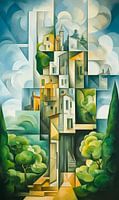 De afbeelding toont een kubistische voorstelling van een landschap met onderling verbonden gebouwen in abstracte, geometrische vormen. Het groen van de vegetatie en de wolken geven diepte en contrast aan de architecturale elementen.
