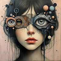 In "Visies van de Ziel" worden we geconfronteerd met een intrigerende mix van surrealistische en hedendaagse kunst. De afbeelding toont een vrouw met een serene, maar ook mysterieuze uitstraling. Haar gezicht is omgeven door een onconventionele compositie van ogen en abstracte vormen, wat de kijker uitnodigt om dieper na te denken over de betekenis van waarneming en bewustzijn.