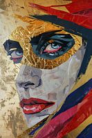 Details: portret, vrouw, modern, abstract, kleurrijk, goud, rood, blauw, wit, zwart