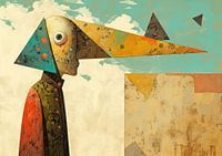 Visionary Prism - Dit surrealistische schilderij toont een figuur met een geometrisch gevormd hoofd bestaande uit driedimensionale driehoeken in verweerde, veelkleurige tinten en een oog prominent in het midden, gestoken in een kleurrijk gespikkeld jasje dat bijna lijkt te smelten in de zachte, aardetintige achtergrond.