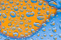 Allemaal kleine oranje visjes in waterdruppels tegen een blauwe achtergrond. Leuk voor in de kinderkamer! De waterdruppels reflecteren de tekening van de vis op de achtergrond en zorgen ervoor dat het visje in ieder druppeltje zichtbaar is. Zo lijkt het net of de visjes in zo'n druppeltje rondzwemmen. De foto werd door een glasplaat met waterdruppels heen gemaakt.