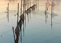 Landschap van het Veerse meer met visnetten in vroege ochtendlicht.