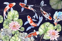 Vissen koekarpers in het water met mooie waterlelies met blad gemaakt in aquarel en digitaal bewerkt.
