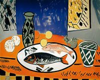 Het schilderij is een krachtig expressionistisch werk dat een stilleven toont van twee vissen, citroenen en een karaf bij een opengeslagen raam. Het raam kijkt uit op een zomerse omgeving, met een diepblauwe lucht.