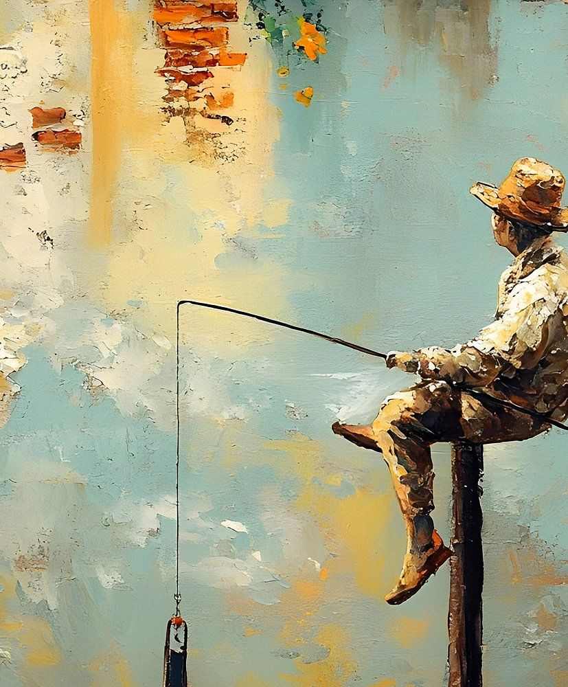 Deze schilderachtige afbeelding van een man die ontspannen aan een paal zit te vissen tegen een verweerde muur, roept een gevoel van rust en tijdloze eenvoud op, perfect voor liefhebbers van traditionele momenten in de natuur.