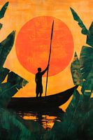 In een glinsterende oranje tint die de scène in warm licht baadt, rijst een eenzame visser op zijn boot op, speer in de hand. Omlijst door weelderige groene bladeren verbeeldt de silhouetfiguur de kalme vastberadenheid van een oud ambacht, terwijl de zon aangenaam aan de horizon zweeft en afscheid neemt van de dag.