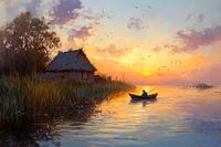 De lucht gloeit in zachte kleuren in het gouden licht van de zonsondergang, terwijl een eenzame visser het kalme wateroppervlak kamt. Omlijst door weelderige planten en een bescheiden huis met rieten daken, straalt het tafereel een vredige melancholie uit en nodigt het uit om te dromen. De zachte golven weerspiegelen de stilzwijgende…