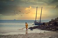 Visser op het cancale strand, met zonsondergang, vogels en de Mont Saint Michel op de achtergrond.
