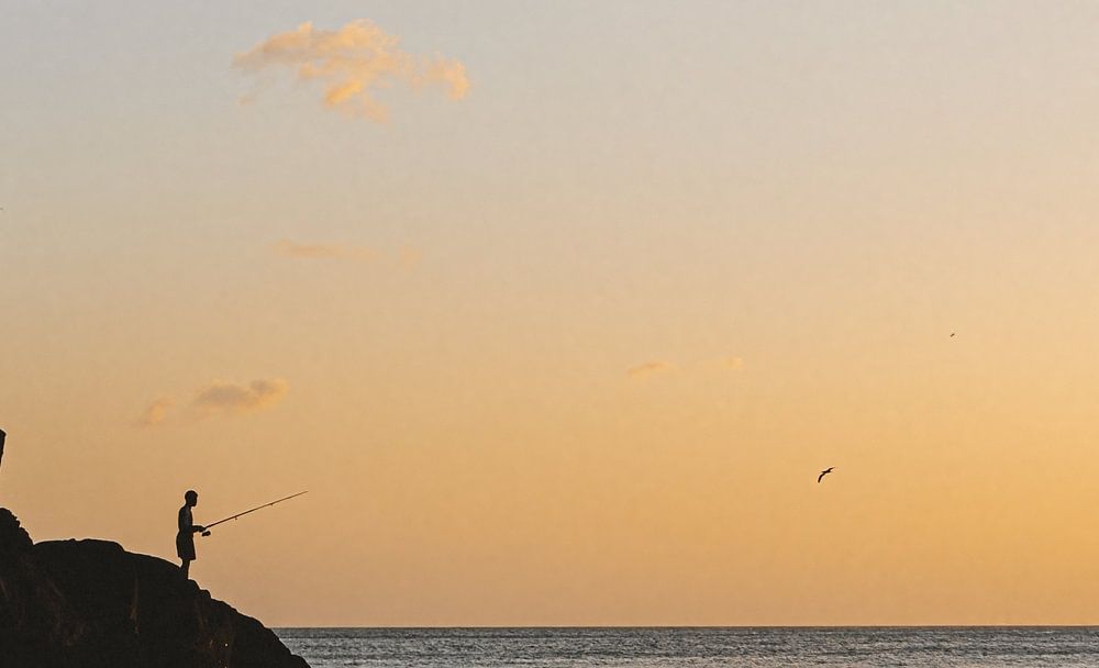Een visser aan het vissen op de rotsen langs de kust van Grenada.