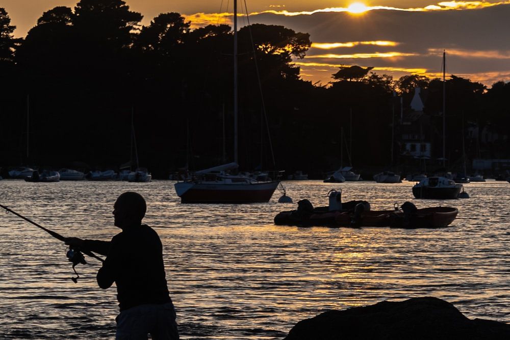 Een visser probeert tijdens zonsondergang nog wat te vangen in het estuarium van de Odet. De bootjes in de achtergrond dobberen in de natuurlijke haven van Bénodet.