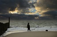 Een eenzame visser op het strand aan de Noordzee, terwijl de donkere wolken over de zee aan komen drijven. Hij blijft onbewogen staan, niet bang voor wat komen gaat. Een stoere man.