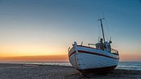 Koop de foto Visserboten op het Deense strand bij zonsondergang. van Menno Schaefer als print op canvas, aluminium dibond, (ingelijste) fotoprint, behang en ArtFrame. Voor jou op maat geprint in Fine-Art kwaliteit.
