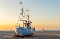 Koop de foto Visserboten op het Deense strand bij zonsondergang. van Menno Schaefer als print op canvas, aluminium dibond, (ingelijste) fotoprint, behang en ArtFrame. Voor jou op maat geprint in Fine-Art kwaliteit.