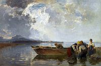 Mannen en vrouwen halen de vangst uit hun boot. De vissen die gevangen zijn zitten in het net waar de mensen mee bezig zijn in het water. Een visser zit nog in het schip voor de bergen.