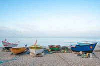 Zacht pastel kleurige lucht, een kalme zee en gekleurde boten op het strand in frankrijk.
