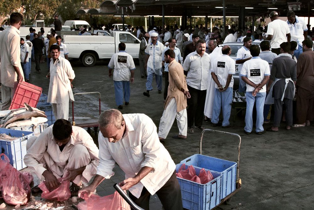 Vissers verkopen verse vis op de dagelijkse vismarkt. Dubai vismarkt in Deira, Verenigde Emiraten
