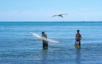 Het vangen van vis in Mexico, terwijl een pelikaan wacht op zijn verandering.