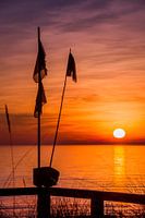 Zonsopgang in Scharbeutz aan de Oostzee in Noord-Duitsland. Vissersboei op het Oostzeestrand aan de Luebecker baai in Schleswig Holstein in het sfeervolle zonlicht. Staand beeld.