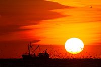 Vissersboot vaart bij de ondergaande zon met meeuwen achter het schip. Zonsondergang met kleurrijke lucht en wolken boven zee vanaf het strand.
